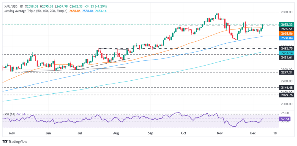 Giá vàng tiếp tục leo lên gần mức $2,700, được hỗ trợ bởi kỳ vọng mạnh mẽ rằng Cục Dự trữ Liên bang Mỹ (Fed) sẽ cắt giảm lãi suất vào tháng 12.