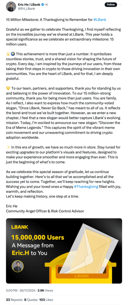 On November 28, 2024, during the festive spirit of Thanksgiving, Eric He, LBank’s community angel officer and risk control adviser, announced on social media that LBank has officially reached 15 million registered users, and shared the thanksgiving for users’ support.