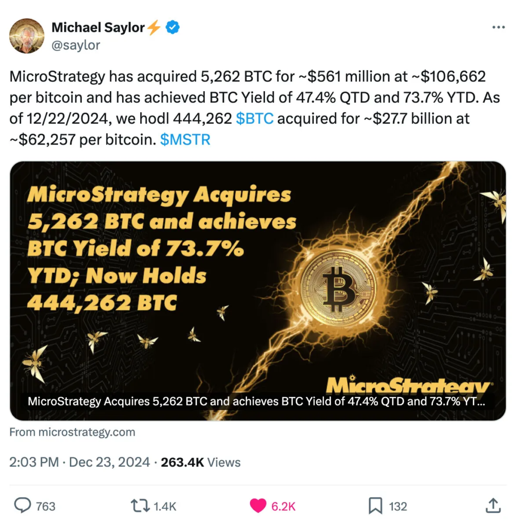 Vào tháng 12, ông đã thuyết phục các cổ đông của Microsoft về việc áp dụng Bitcoin, kêu gọi gã khổng lồ công nghệ đầu tư một phần trong số 78,4 tỷ đô la tiền mặt và các khoản tương đương vào tiền điện tử. “Microsoft không thể bỏ lỡ làn sóng công nghệ tiếp theo, và Bitcoin chính là làn sóng đó,” Saylor tuyên bố trong một bài thuyết trình video.